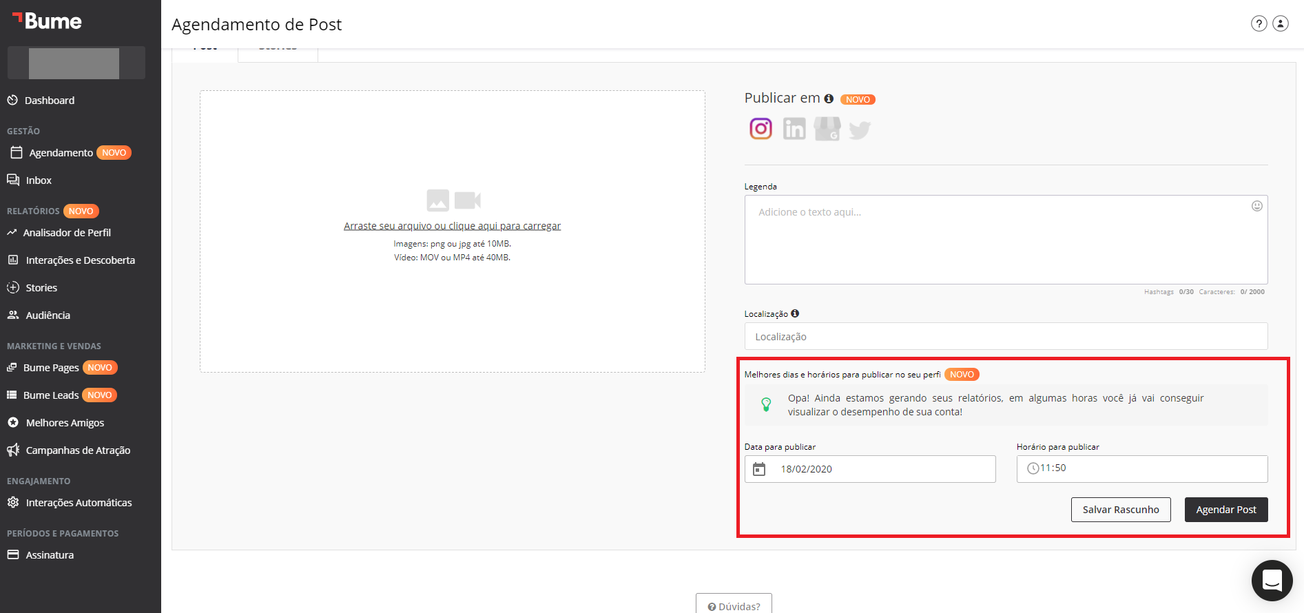 O Bume é considerada uma ferramenta mais robusta, porque tem recursos mais avançados. Ela permite o agendamento de posts e stories do Instagram, LinkedIn, Twitter e Google Meu Negócio.